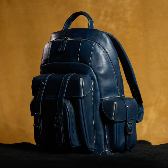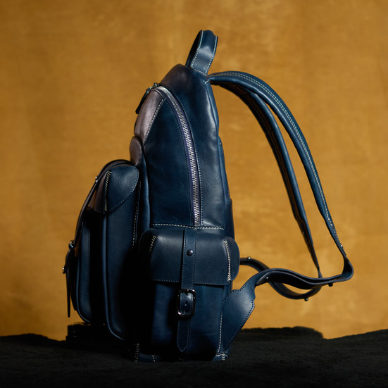 Presenting our Marine-Blue Bespoke Leather Backpack, a standout piece in our executive travel luggage series.